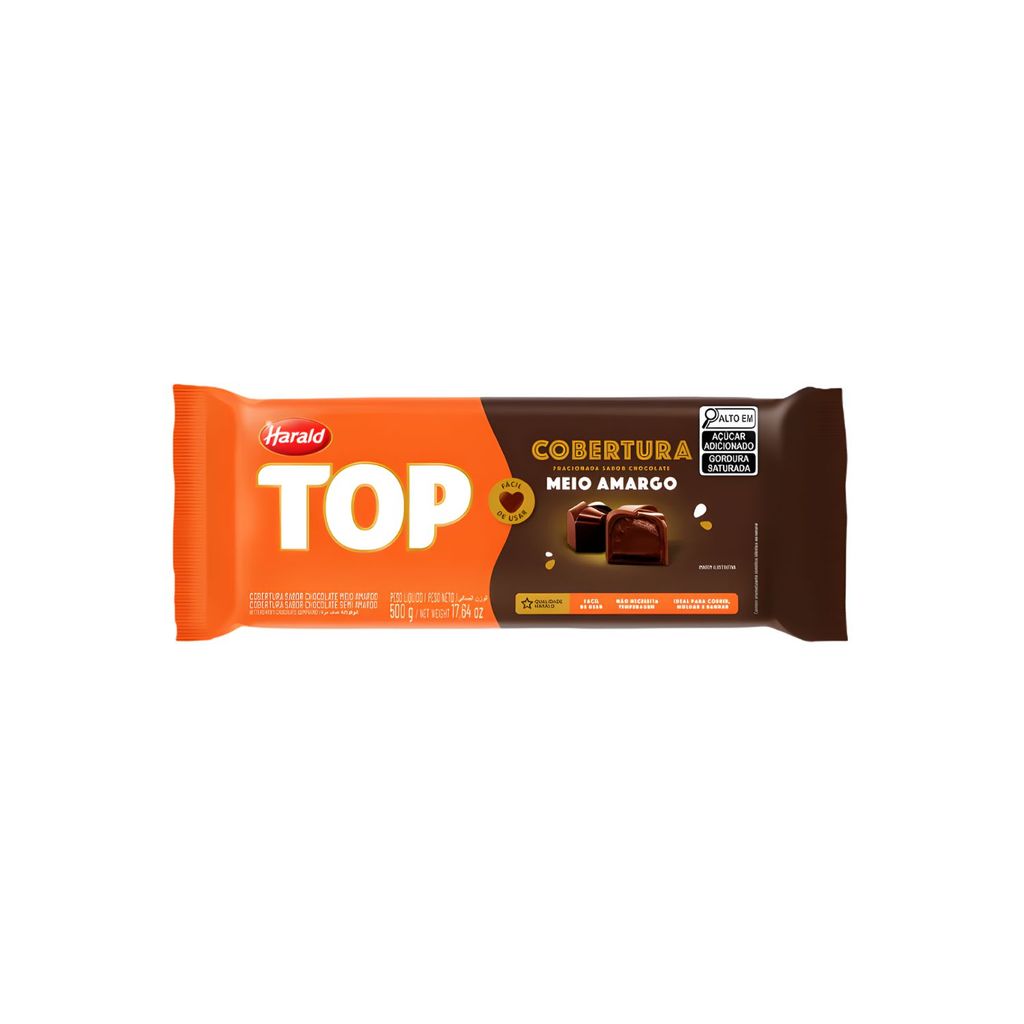 A Cobertura Top Meio Amargo 500g da Harald é uma cobertura de chocolate ideal para confeitaria e chocolateria. Com sabor equilibrado entre doce e amargo, proporciona acabamento brilhante e sabor marcante em produtos como bombons, trufas, pães de mel, ovos de Páscoa e sobremesas especiais.