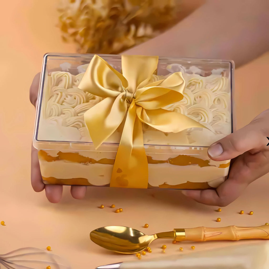 o formato retangular optimiza o espaço em vitrines, mesas de festa ou balcões de entrega. Ideal para mousses, pavês, bolos fatiados, tortas pequenas ou qualquer sobremesa com montagem em camadas. Excelente para apresentar produtos com acabamento decorativo visível através da caixa cristal.