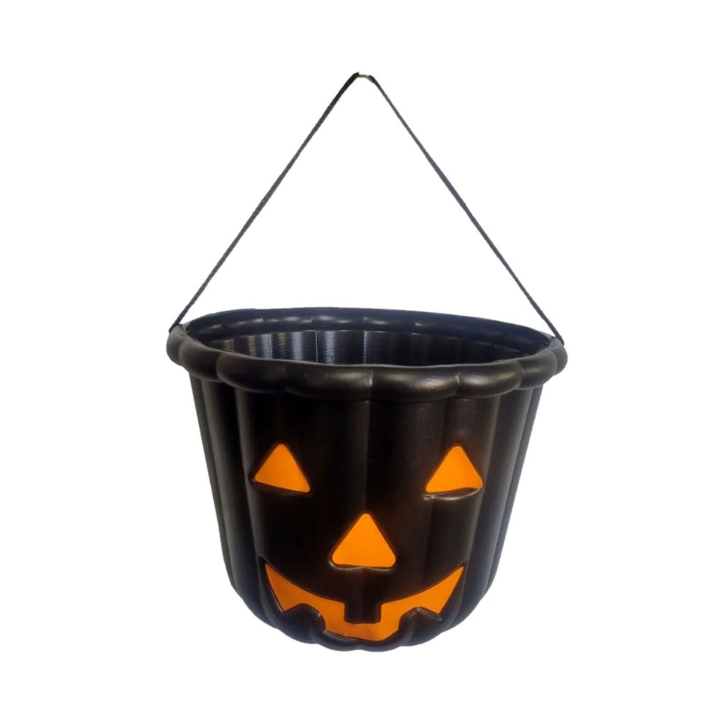 - cor: corpo preto com rosto laranja, formato de abóbora típica de Halloween